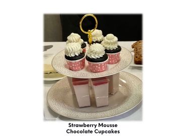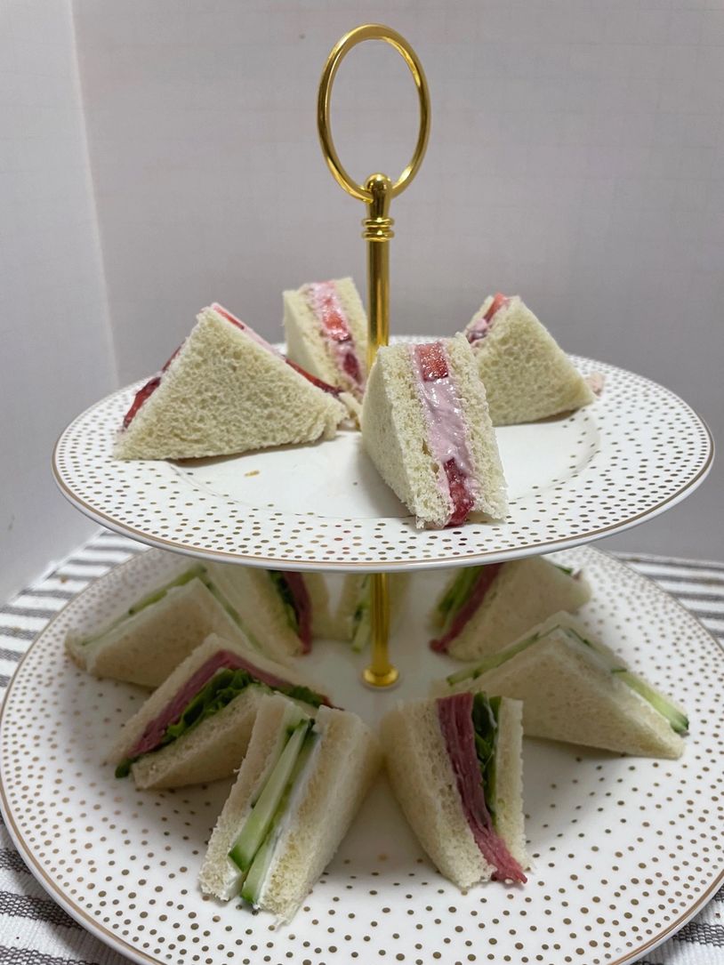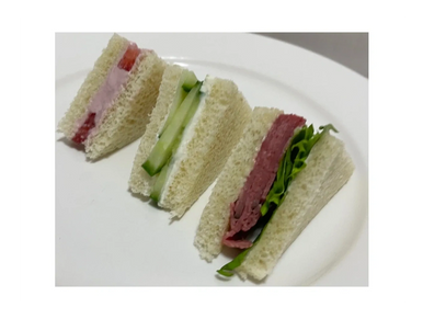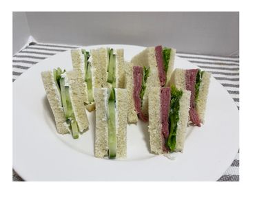 Delicate little triangle sandwiches served on a china tea tray. Bread crust is removed before serving. Featuring Strawberries & Cream, Cucumber & Cream Cheese , Roast Beef with horseradish mayonnaise with greens.