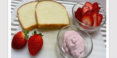 2 Slices of bread, Fresh strawberries mixed with sugar and clotted Cream. Sliced fresh berries with a touch of sugar. Spread the cream on both slices of the bread, layer with thinly sliced berries. trim the crust and cut diagonally into 4 pieces.