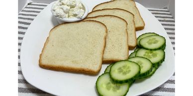 2 Slices of bread, chive cream cheese and English cucumber. Spread the cream cheese mixed with chives onto both slices of the bread. Layer one slice with very thinly sliced English cucumbers. Trim the crust and cut diagonally into 4 pieces.