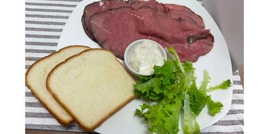 2 Slices of bread, 3-4 oz of roast beef, greens, and horseradish mayonnaise. Spread a thin layer of mayonnaise onto both slices of the bread. Layer one slice with very thinly sliced roast beef and then greens. Trim the crust and cut diagonally into 4 pieces.